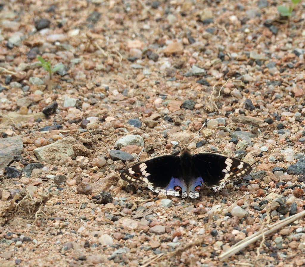 It was fairly small. Was this it? We watched in dismay as it quickly flew away into the scrub somewhere on the side of the embankment. But then we realised it was sitting on the tiny rocks in the middle of the track. I started snapping away with my camera, but it was hard to see. With its wings snapped shut, the underside colours blended seamlessly with the sand and pebbly rocks on the track. I moved a tiny bit closer. It opened its wings ever so slightly. I saw black and white on the forewings. And then, the tiniest little smidge of blue was evident on the lower wings. Then it opened its wings a little wider, to bask in the sun, revealing the azure blue on his upperside hindwings. This was him – a Blue Argus! At last!