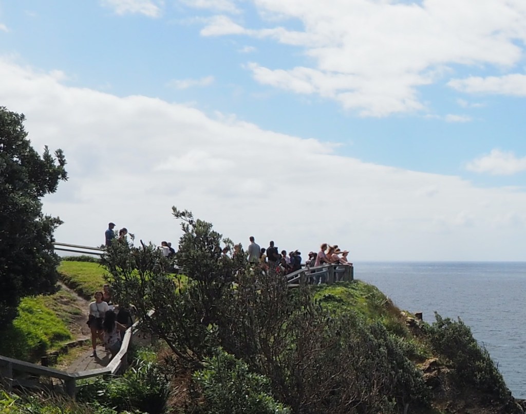 The next beach is Little Wategos, and there’s a great lookout here with panoramic views from a windswept headland. Once you climb back up the staircases from here, it’s onwards and upwards to the lighthouse. There are a lot more stairs to negotiate, but after a few hundred metres, you’ll arrive at the easternmost point on the Australian mainland. The day we did this walk was a public holiday, so the walking track was busy. At this lookout there were lots of people milling about, waiting to take selfies in front of the landmark sign. We decided to stop here for a drink break and wait for the crowds to die down. This didn’t happen, and after about half an hour of politely waiting for the same group to move on, we just snapped a few quick shots and went on our way.